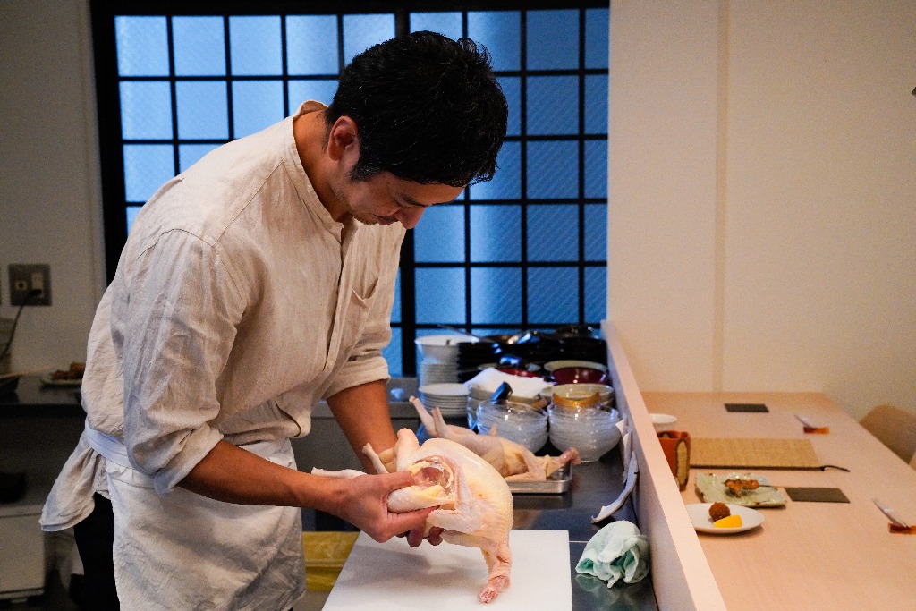 鳥肉は、部位ごとに非常に細かく分類されており、それぞれに名前がついています。同じ鳥肉でも、名前が違う部分は、まったく違う味わいがあり、適した調理方法も異なります。“鳥料理 純”ではご予約ごとに丸鳥を1羽仕入れ、お客様のために最適な調理をしてお出ししております。三河赤鶏のおいしさを丸ごとご堪能ください。